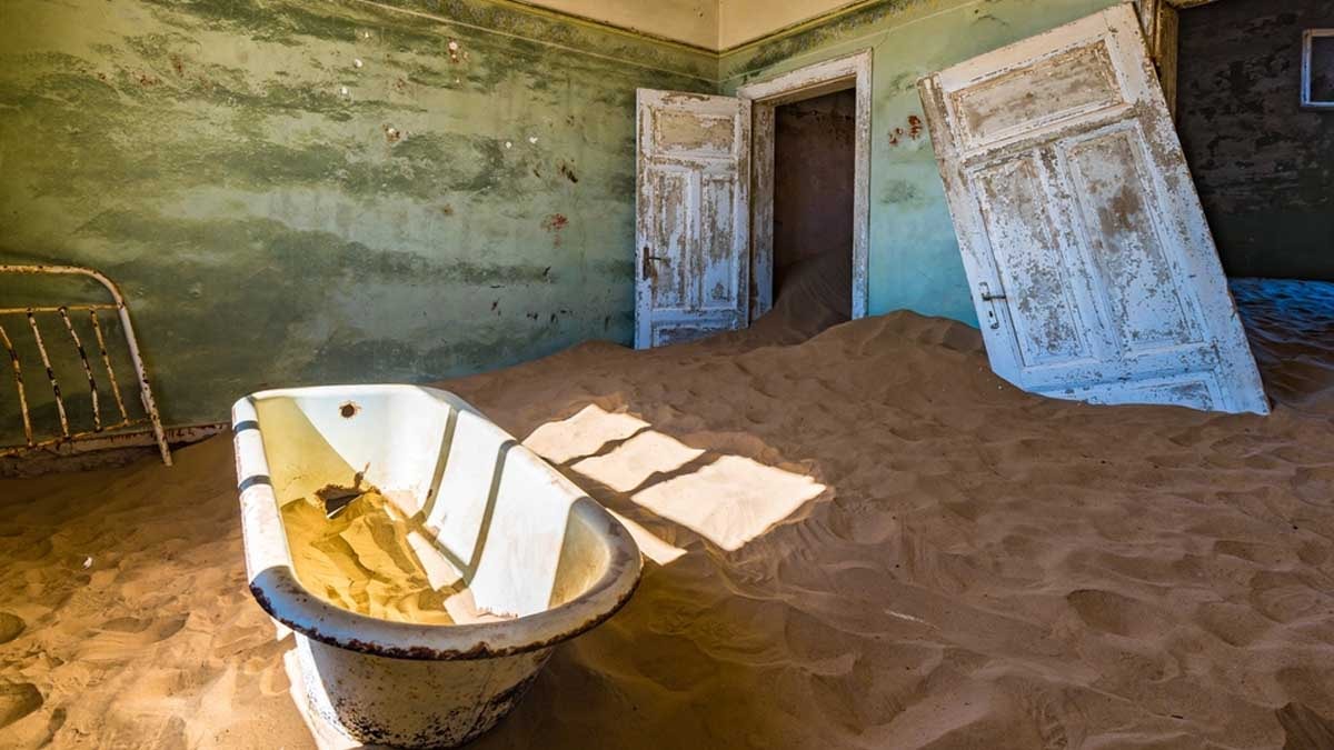 Namibya’nın çöl bölgesinde yer alan Kolmanskop, 1908 yılında Alman kolonistler tarafından keşfedilen elmas madenlerinin ardından hızla gelişti. Lüks evler, hastaneler ve hatta bir tiyatroya sahip bu zengin kasaba, elmas rezervlerinin tükenmesi ve ekonomik durgunlukla birlikte 1950’lerde terk edildi. Bugün, çöl kumları tarafından yavaş yavaş yutulan binalar, ziyaretçilere dramatik bir sahne sunuyor. Kolmanskop, özellikle fotoğrafçılar için popüler bir durak haline geldi.
