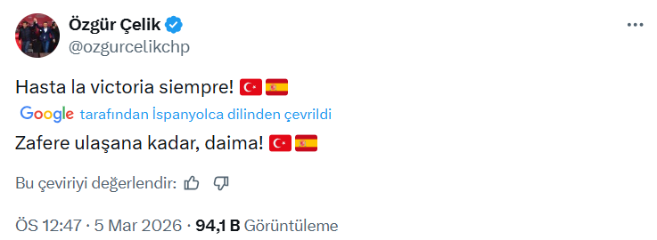 CHP İstanbul İl Başkanı Özgür Çelik, İspanyolca “Zafere ulaşana kadar daima!” anlamına gelen "Hasta la victoria siempre! 🇹🇷🇪🇸" paylaşımında bulundu.