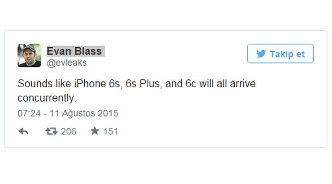 Teknoloji dünyasında gelişen olayları anında paylaşan @Evleaks‘in attığı tweet’e göre iPhone 6C, iPhone 6S ve iPhone 6S Plus modelleri birlikte tanıtılabilir. Söylentiler iPhone 6C'nin metal kasa ile geleceğini gösteriyor.
