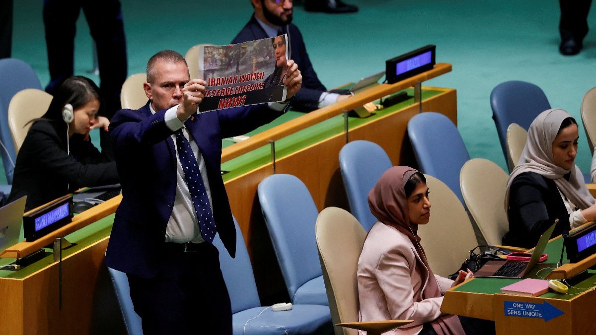 Reisi kürsüdeyken İsrail'in BM Temsilcisi Gilad Erdan, elinde geçen sene başörtüsü kuralına uymadığı gerekçesiyle Tahran'da gözaltına alındıktan sonra ölen 22 yaşındaki Mahsa Amini'nin posteriyle ayağa kalktı. Posterde Amini'nin resminin yanında "İranlı kadınlar özgürlüğü hak ediyor" yazıyordu.