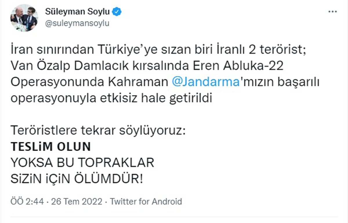 Teröristlere de 'teslim olun' çağrısı yapan İçişleri Bakanı Soylu, "İran sınırından Türkiyeye sızan biri İranlı 2 terörist; Van Özalp Damlacık kırsalında Eren Abluka-22 Operasyonunda Kahraman Jandarma'mızın başarılı operasyonuyla etkisiz hale getirildi. Teröristlere tekrar söylüyoruz: Teslim olun, yoksa bu topraklar sizin için ölümdür" ifadelerini kullandı. (DHA)
