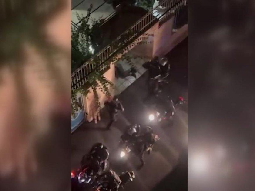 Aldığı darbeler nedeniyle yere düşen göstericiyi bir evin giriş kısmına çeken polisler, burada da göstericiyi coplarla darp etmeyi sürdürüyor.