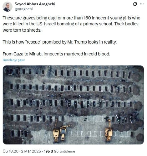 "Bunlar, ABD-İsrail ortak bombardımanında bir ilkokulda hayatını kaybeden 160'tan fazla masum genç kız için kazılan mezarlar. Cesetleri paramparça olmuştu.