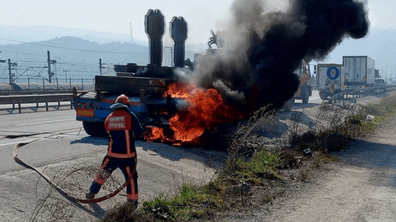 Adapazarı yönünden Bilecik yönüne giden 41 PL 722 plakalı iş makinesi yüklü TIR, öğle saatlerinde D-650 kara yolunun Pamukova Mekece Mahallesi mevkiine geldiğinde lastikleri tutuştu.