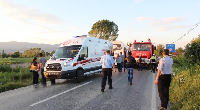 Kaza 20.30 sıralarında Mudurnu Karayolu’nun Doğancı Mahallesi mevkiinde meydana geldi. Turgut Özdemir’in kullandığı 12 BC 049 plakalı bir piliç firmasında çalışan işçileri iftar vaktinde paydos edilmesi sebebiyle evlere taşıyan servis midibüsü, yola traktörün aniden çıkması üzerine ani fren yaptı. Bu sırada arkasından gelen Koray Özkan yönetimindeki 14 BT 265 plakalı aynı firmaya ait işçileri taşıyan başka bir midibüs, önündeki midibüse arkasından çarptı. Çarpmanın etkisiyle yol kenarındaki boş tarlaya giren midibüs, elektrik direğine çarparak durabildi.