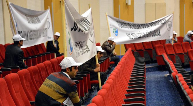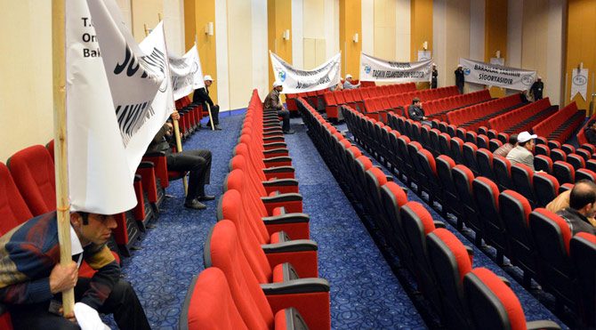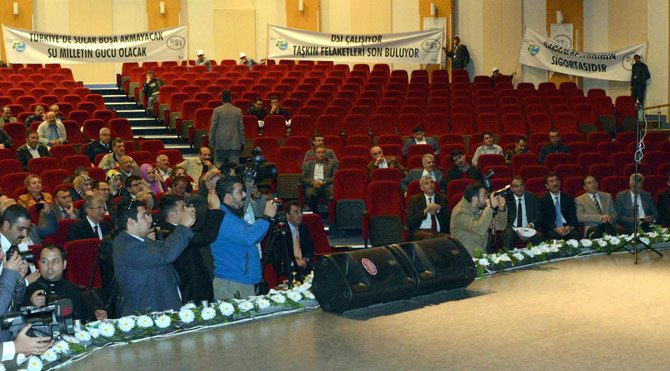 Törenden önce salonun arka kısmında yer alan DSİ'nin sözleşmeli işçileri, üzerinde, 'Su bize, DSİ suya hayat veriyor', 'DSİ çalışıyor taşkın felekatleri son buluyor', 'Türkiye'de sular boşa akmayacak su milletin gücü olacak', 'DSİ toprağa can hasata bereket katıyor', 'DSİ Türkiye'nin aydınlık geleceğine hayat veriyor', 'Barajlar tarımın sigortasıdır' yazılı pankartları tuttu. Her pankartı gergin biçimde iki ucundan tutan işçiler, yazıların okunmasını sağladılar. Yaklaşık 2.5 saat kadar süren tören boyunca hem ayakta duran hem de oturarak pankartları tutan işçiler, zor durumda kaldı. Zaman zaman koltuklara oturarak dinlenen işçiler tören bitimi ile birlikte derin bir nefes aldı.