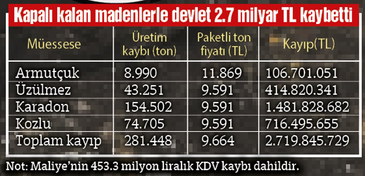 Kömür üretilemediği için TTK 2.3 milyar lira gelirden, Hazine ve Maliye Bakanlığı da 453 milyon lira vergiden oldu. Devletin toplam kaybı 2.7 milyarı aştı.