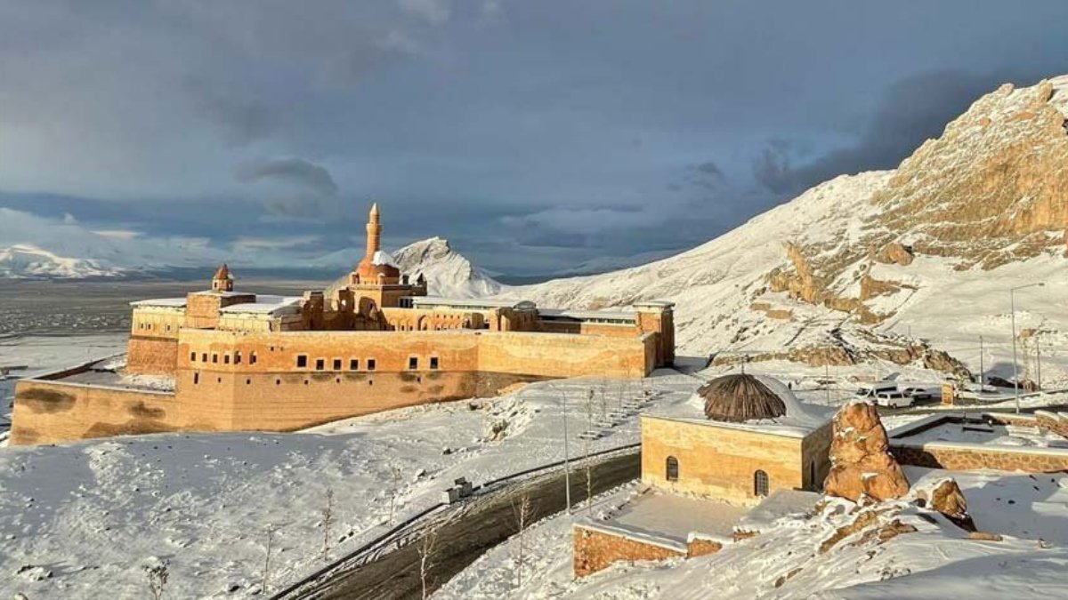 Ağrı'nın Doğubayazıt ilçesinde bulunan tarihi İshak Paşa Sarayı, mevsimin ilk karıyla beyaz örtüyle kaplandı.