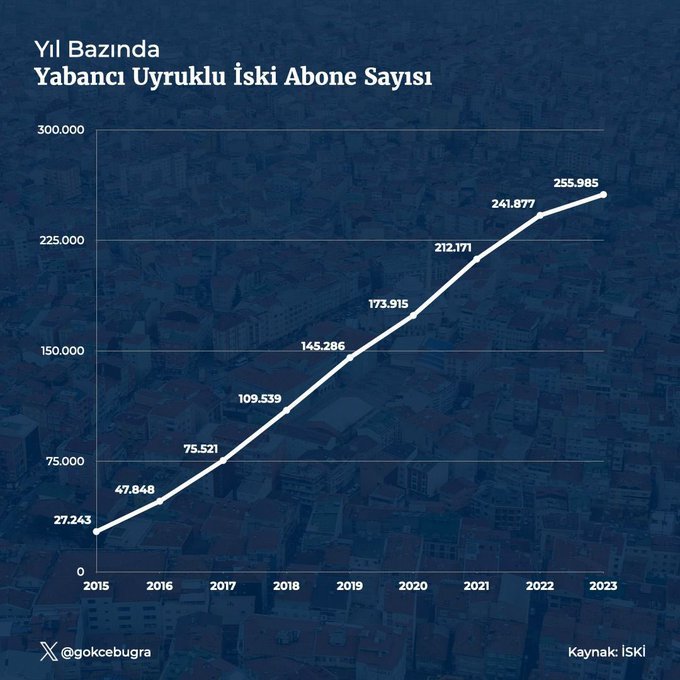Yabancı uyruklu İSKİ abone sayısı 8 yılda yaklaşık 10 kat arttığına dikkat çeken Gökce “ 2019 yılında 145 bin yabancı uyruklu abone varken bu sayı bu yıl 255 bin 985’e çıktı. İstanbul'da ortalama hane büyüklüğü 3,3 düzeyindeyken, yabancı abonelerde bir çok hane birlikte yaşadığı için hane halkı büyüklüğü 8-10 düzeyini dahi aşabiliyor. Geçici sığınmacı, konut satışı ile vatandaşlık almış şahıslar, geçici çalışma veya ikamet izni olanlar ile kaçak göçmenler dahil toplam yabancı nüfus vatandaş nüfusumuzun yüzde 16’sına ulaşmış durumda” dedi.