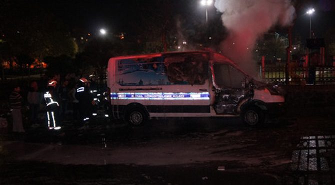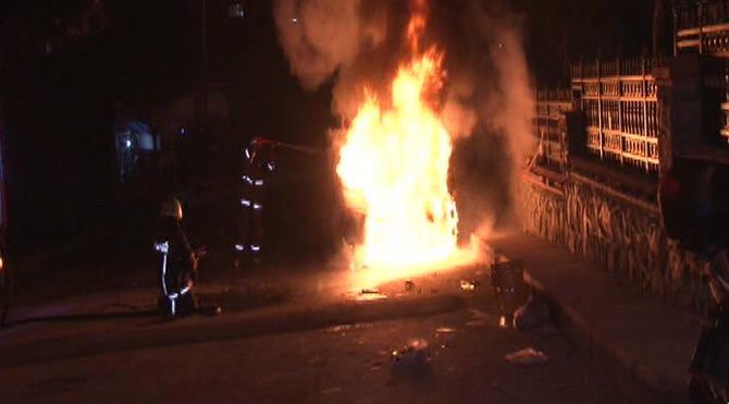 Molotoflu saldırı saldırı sonrası alev alev yanan İSKİ aracı, itfaiye ekiplerinin müdahalesiyle söndürüldü. Araç kullanılamaz hale geldi.