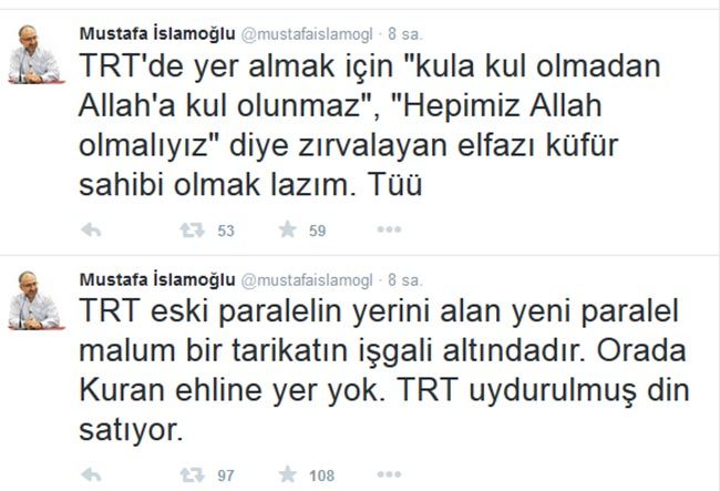Mustafa İslamoğlu, sosyal medya hesabında yapmış olduğu açıklamasında, "TRT eski paralelin yerini alan yeni paralel malum bir tarikatın işgali altındadır. Orada Kuran ehline yer yok. TRT uydurulmuş din satıyor. TRT'de yer almak için "kula kul olmadan Allah'a kul olunmaz", "Hepimiz Allah olmalıyız" diye zırvalayan elfazı küfür sahibi olmak lazım. Tüü" diye yazdı.