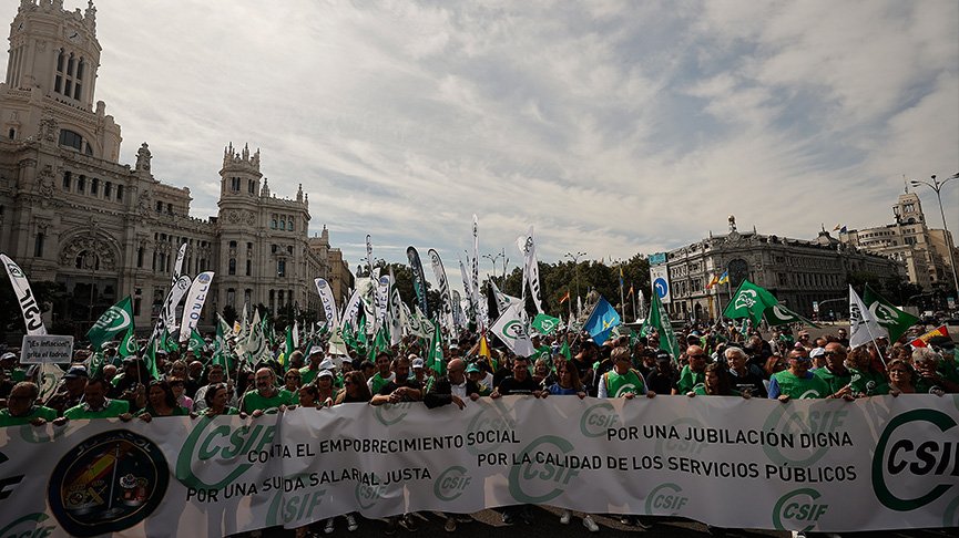 İspanya Memurlar ve Serbest Çalışanlar Sendikasının (CSIF) çağrısıyla başkent Madrid'de düzenlenen gösteriye katılan binlerce kişi, "sosyal yoksullaşmaya karşı adil bir maaş artışı, düzgün bir emeklilik ve kaliteli kamu hizmeti" talebiyle yürüdü.