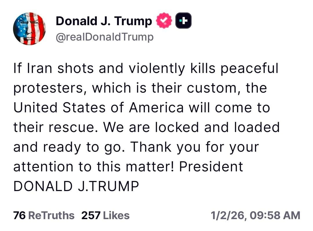 Bu görüntüler üzerine ABD Başkanı Donald Trump da olaylara dahil oldu. Sosyal medya üzerinden yaptığı paylaşımda Trump, "İran, her zamanki gibi barışçıl protestoculara karşı şiddete başvurur ve onları vurup öldürürse, Amerika Birleşik Devletleri protestocuların yardımına koşacaktır. Silahlarımız hazır, ateş etmeye hazırız." açıklamasını yaptı. Trump, İran'ı resmen savaşla tehdit etti.