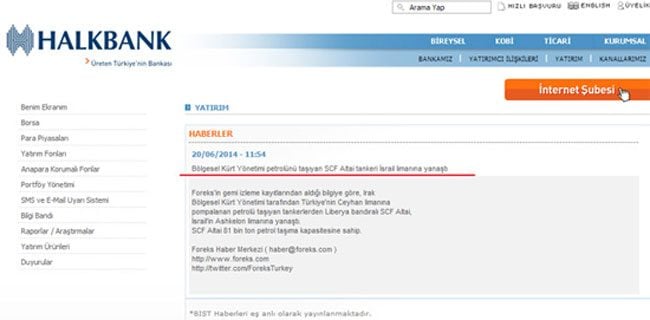 Halkbank’ın internet sitesi de Kürt petrolünü Türkiye üzerinden İsrail’e taşıma işini 20 Haziran’da kendi sitesinden duyurmuştu. Halkbank’ın sitesinde yer alan haberde şu ifadeler kullanılmıştı: