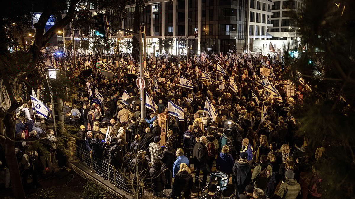 İsrail'in başkaneti Tel Aviv'de Savunma Bakanlığı binası önündeki Eliezer Kaplan Caddesi'nde toplanan binlerce gösterici, İsrail bayrakları ve Netanyahu hükümetini eleştiren, pankart, afiş ve dövizler taşıdı.