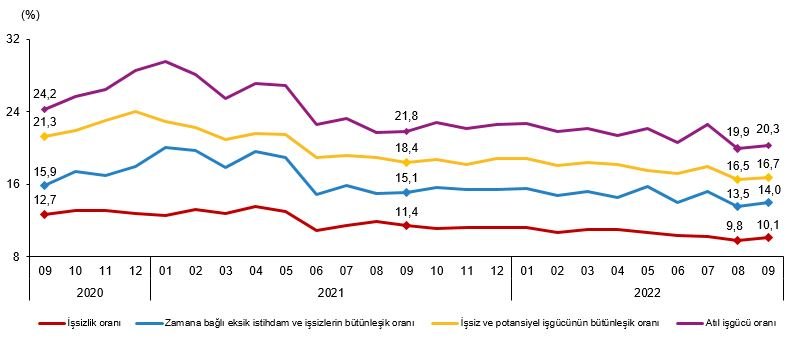 Zamana bağlı eksik istihdam, potansiyel işgücü ve işsizlerden oluşan atıl işgücü oranı 2022 yılı eylül ayında bir önceki aya göre 0,4 puan artarak yüzde 20,3 oldu.