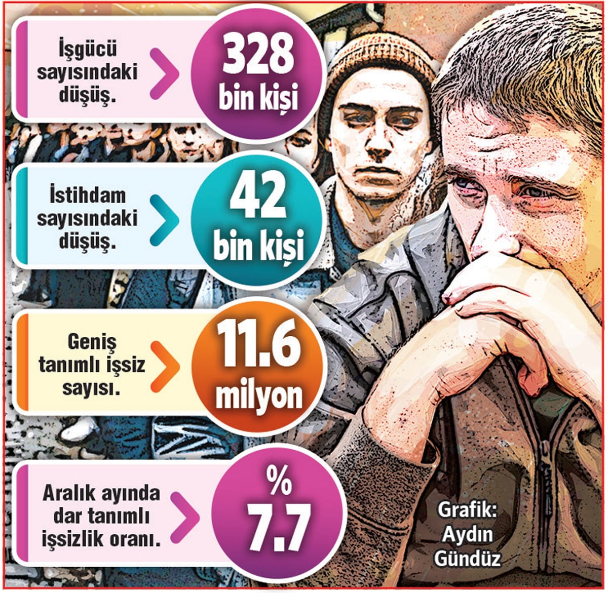 Aralıkta istihdam edilenlerin sayısı aylık bazda 42 bin kişi azalarak 32 milyon 685 bin kişi, istihdam oranı ise aynı seviyede kalarak yüzde 49.1 oldu. Yine işgücü de bir önceki aya göre 328 bin kişi azaldı ve 35 milyon 421 bin kişi olarak hesaplandı. İşgücüne katılma oranı ise 0.5 puan azalarak yüzde 53.2 olarak gerçekleşti. Zamana bağlı eksik istihdam, potansiyel işgücü ve işsizlerden oluşan atıl işgücü oranı ise 0.3 puan azalarak yüzde 28.6 oldu. Geniş tanımlı kadın işsizliği ise yüzde 38.3 ile en yüksek işsizlik oranı olmaya devam etti.