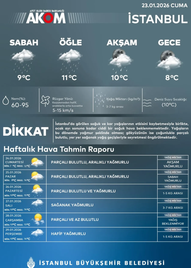 Kar yağışı ile ilgili açıklama yapan AKOM, "İstanbul’da görülen soğuk ve kar yağışlarının etkisini kaybetmesiyle birlikte, ocak ayı sonuna kadar ciddi bir soğuk hava beklenmemektedir. Yağışların bu dönemde yağmur şeklinde olması, gökyüzünün ise çoğunlukla parçalı bulutlu, yer yer sağanak yağış geçişleriyle seyretmesi öngörülmektedir" ifadelerine yer verdi.