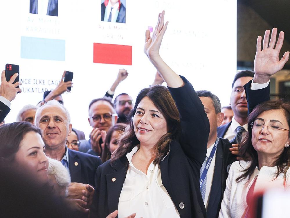 Seçim sonuçlarının açıklanmasının ardından salonda “İlk kadın başkan Filiz Başkan”, “Bu daha başlangıç mücadeleye devam”, “Hak, hukuk, adalet” sloganları atıldı.