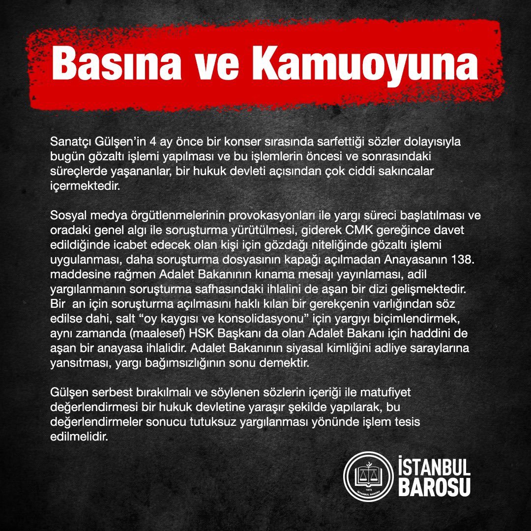 *Sanatçı Gülşen'in 4 ay önce bir konser sırasında sarf ettiği sözler dolayısıyla bugün gözaltı işlemi yapılması ve bu işlemlerin öncesi ve sonrasındaki süreçlerde yaşananlar, bir hukuk devleti açısından çok ciddi sakıncalar içermektedir.