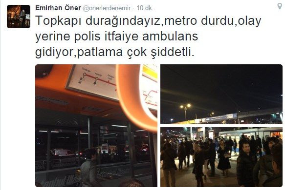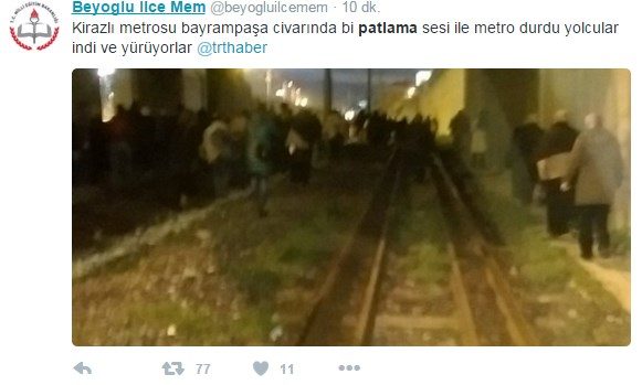 İstanbul'da metroda patlama meydana geldi. Vali Şahin Bayrampaşa metrosunda meydana gelen patlama ile ilgili olarak açıklama yaptı ve 1 vatandaşın yaralandını ifade etti. Yol kenarına bırakılmış parça tesirli bombanın patlama sesi diğer semtlerden de duyulduğu öğrenildi. Patlama sonrası metro seferleri durduruldu ve bölgeye çok sayıda ambulans yönlendirildi. Metro seferlerinin durudurulması da İstanbul'da pek çok yerde trafiğin kitlenmesine yol açtı!