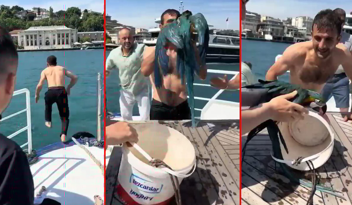 İstanbul Boğazı’nda tur teknesiyle boğaz turu yapan yolculardan birinin papağanı uçarak denize düştü. Papağanın denizde çırpındığını gören yolculardan biri ise üzerini çıkararak denize atladı.