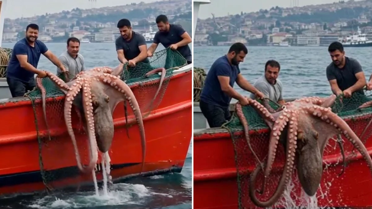 İstanbul Boğazı'nda çekilen bir karede balıkçıların dev bir ahtapot çektiği görüntüler, sosyal medyada hızla yayıldı. Özellikle Instagram ve TikTok'ta çokça paylaşılan videoda 4 balıkçının ağa takılan dev bir ahtapotu kayığa çektiği görülürken, kaydın gerçek olup olmadığı da sorgulandı.