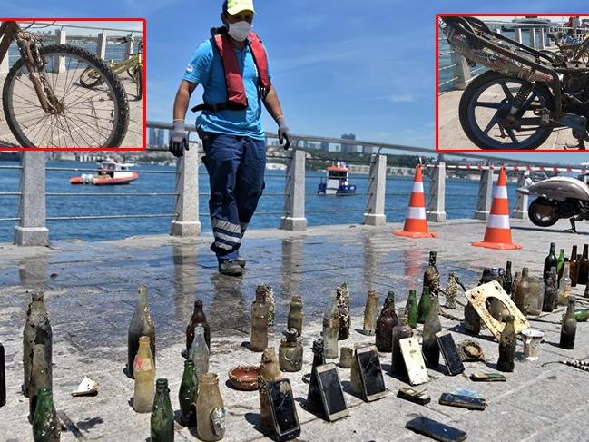 Motosikletten cep telefonuna, otomobil lastiğinden şişeye, bisikletten mataraya, makastan tespihe kadar su altından çıkan atık maddeler, etkinliği izleyen yurttaşları şaşırttı; “deniz altında ne ararsan var” yorumlarına neden oldu.