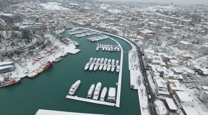 İSTANBUL'da 5 gündür etkili olan kar yağışı tablo gibi manzaralar oluşturuyor. Yoğun yağış sebebiyle İstanbul Boğazı neredeyse tamamen beyaza büründü. Boğaz kenarındaki yürüyüş yollarında bile yaklaşık 20 santimlik kar yüksekliği var. Beyaz örtü sahillerde bağlı olan yat ve motoryatları da kapladı. İstanbul Boğazı beyaz güzelliği ile yürüyüşe çıkanlara yada işi için oradan geçenlere görsel bir şölen sundu.