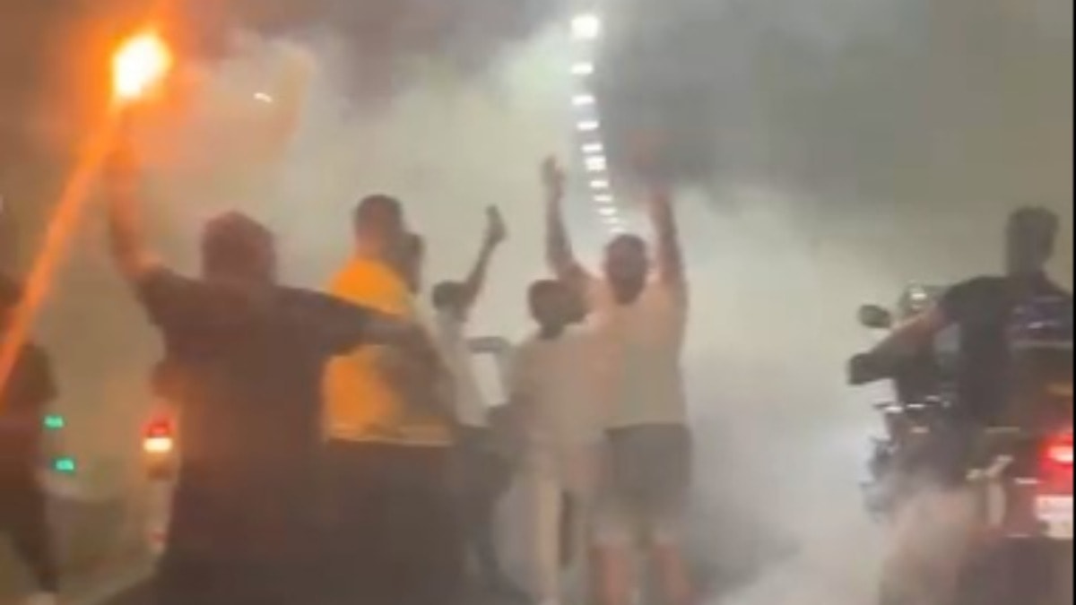 Grubunun meşale yakıp oynaması üzerine trafikte bekleyen diğer sürücüler, yolun kapatılmasına tepki gösterdi.