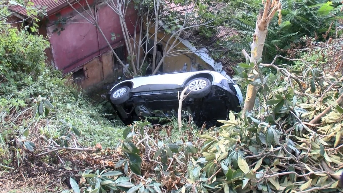 İstanbul'un Sarıyer ilçesinde sürücüsünün direksiyon hakimiyetini kaybettiği cip yol kenarındaki evin bahçesine uçtu. Metrelerce yükseklikten uçan cipin sürücüsü kazayı yara almadan atlattı.