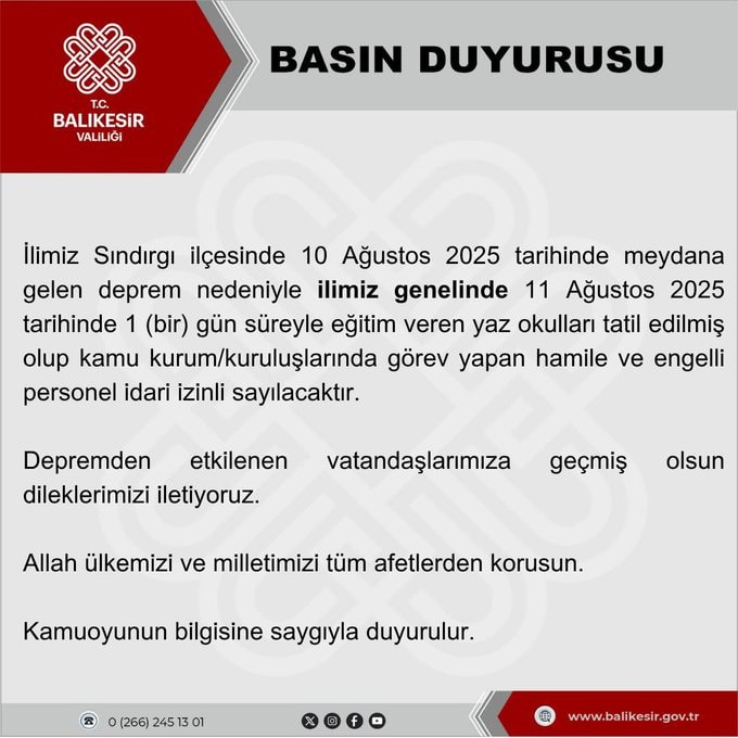 Balıkesir Valiliği tarafından yapılan açıklamada, 11 Ağustos Pazartesi günü (bugün) eğitim veren yaz okullarının tatil edildiği, kamu kurumlarında görev yapan hamile ve engelli personelin de idari izinli sayılacağı kaydedildi.