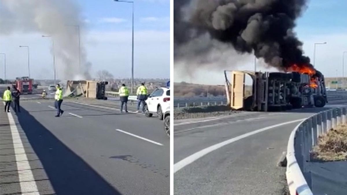 Yan yatan kamyonun motoru yanarken, araçtaki hafriyat da yola döküldü.