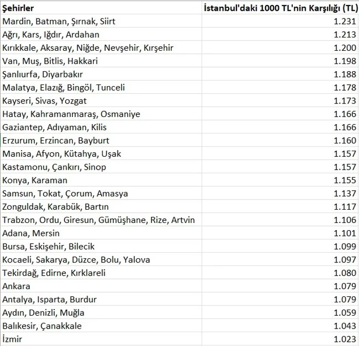 İstanbul'da 1.000 TL'nin alım gücü, Mardin, Batman, Şırnak ve Siirt'te 1.231 TL oluyor. İşte İstanbul'daki 1.000 TL'nin diğer şehirlerdeki karşılığı: