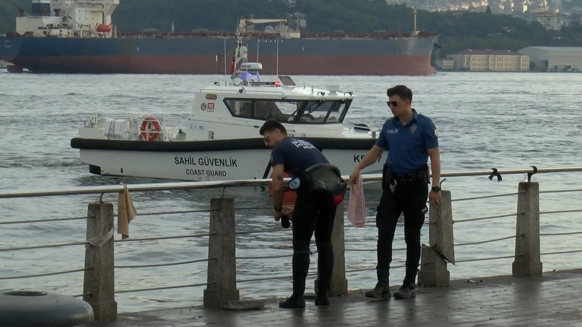 Deniz polisi ile İstanbul İtfaiyesi Sualtı Arama Kurtarma Ekibi'nden dalgıçlar arama çalışmalarını sürdürüyor.