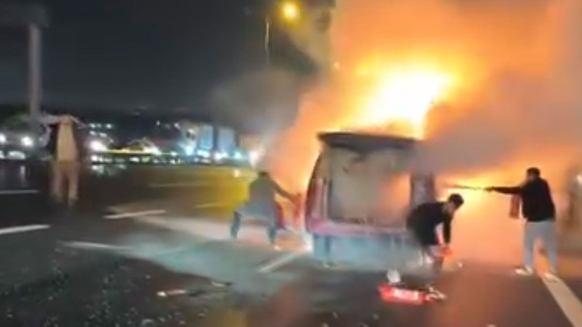 İstanbul, TEM Otoyolu'nda hareket halindeki hafif ticari araçta çıkan yangın kısa sürede söndürüldü. Araç kullanılmaz hala gelirken o anlar çevredekilerin cep telefonu kameralarına yansıdı.