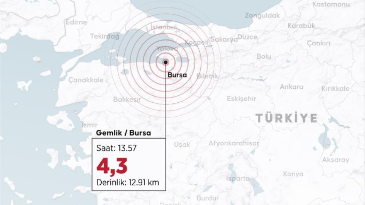 Afet ve Acil Durum Yönetimi Başkanlığı Deprem ve Risk Azaltma Genel Müdürlüğü Deprem Dairesi Başkanlığı'nın sosyal medya hesabından yapılan açıklamaya göre Bursa Gemlik'te 4.3 büyüklüğünde bir deprem meydana geldi.