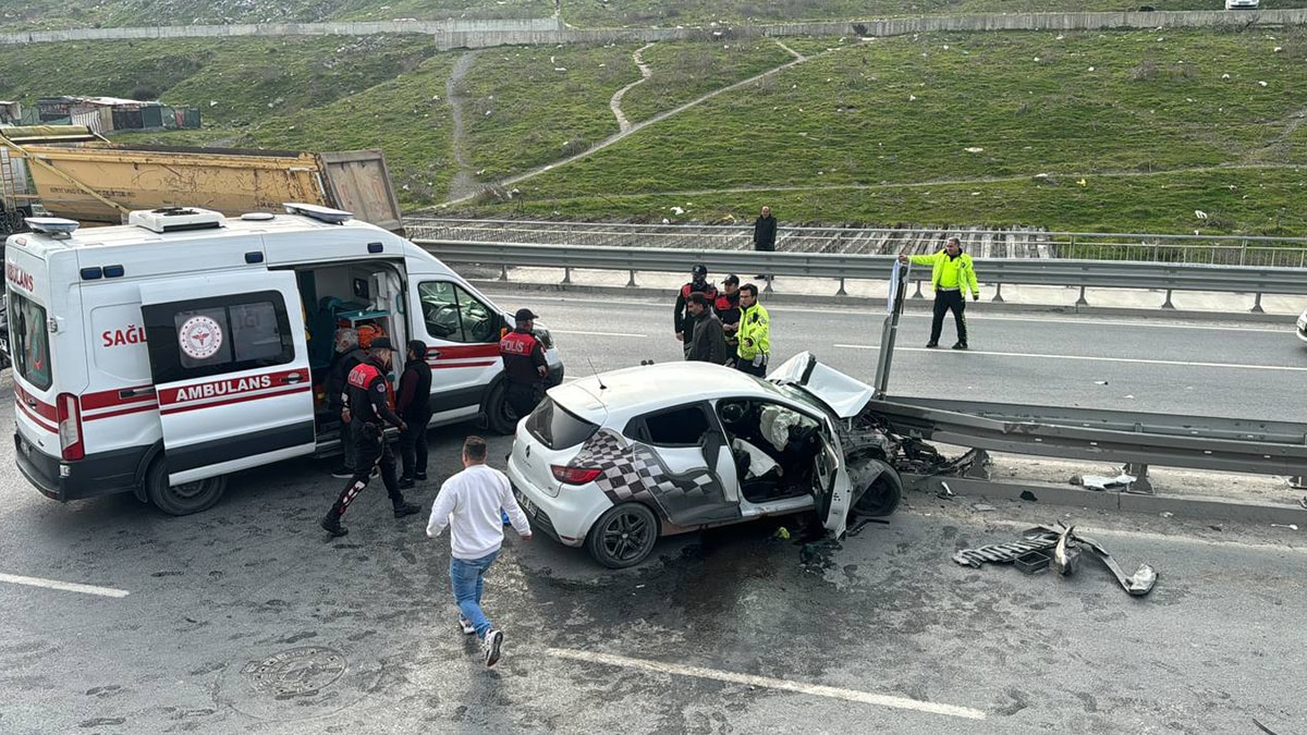 Kontrolden çıkıp yolun kenarındaki bariyerlere çarparak duran araçta sürücü Çetin Y. ve 2 kişi sıkıştı.