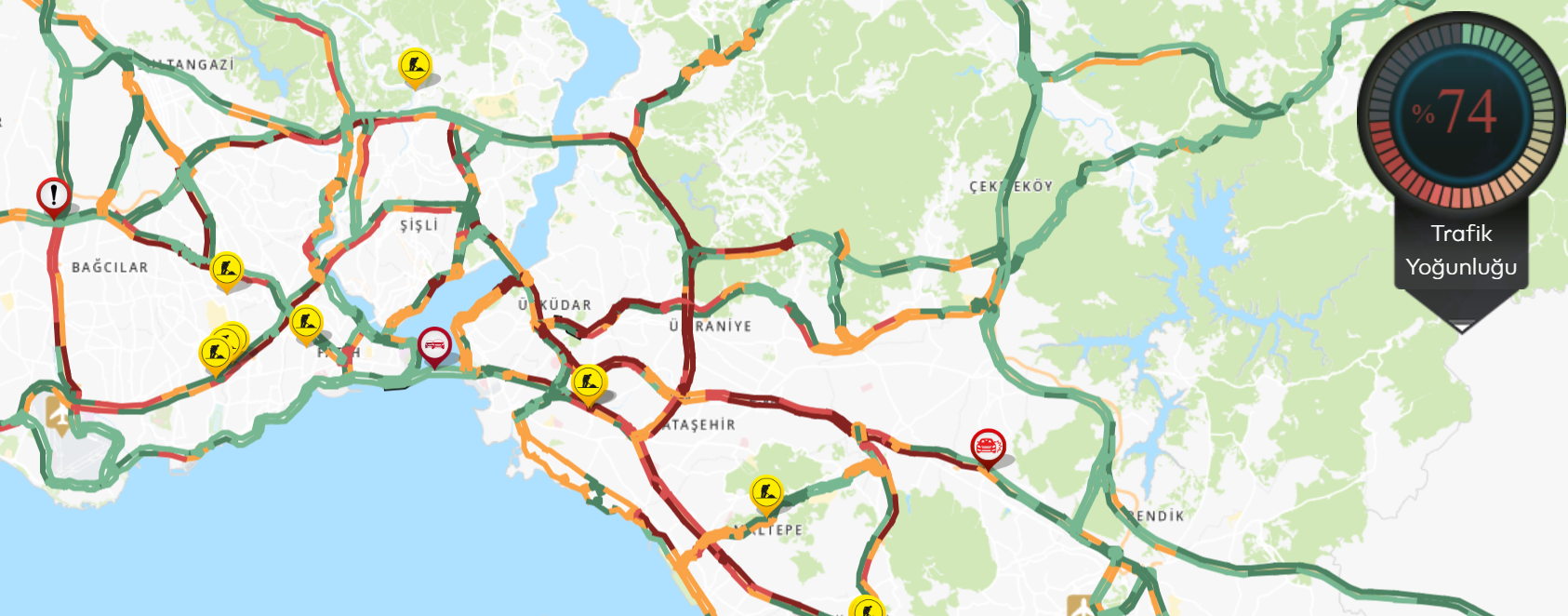 İstanbul Büyükşehir Belediyesi haritasına göre trafik yoğunluğu yüzde 74'te seyrediyor.