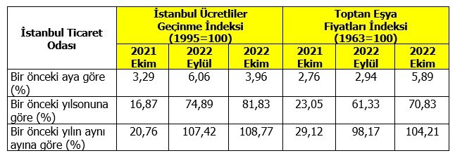 Buna göre, 2021 Ekim ayına göre 2022 Ekim ayında yaşanan fiyat değişimlerini gösteren bir önceki yılın aynı ayına göre değişim oranı İstanbul Ticaret Odası'nın (İTO) 1995 bazlı Ücretliler Geçinme İndeksinde yüzde 108,77, Toptan Eşya Fiyatları İndeksinde ise yüzde 104,21 arttı.