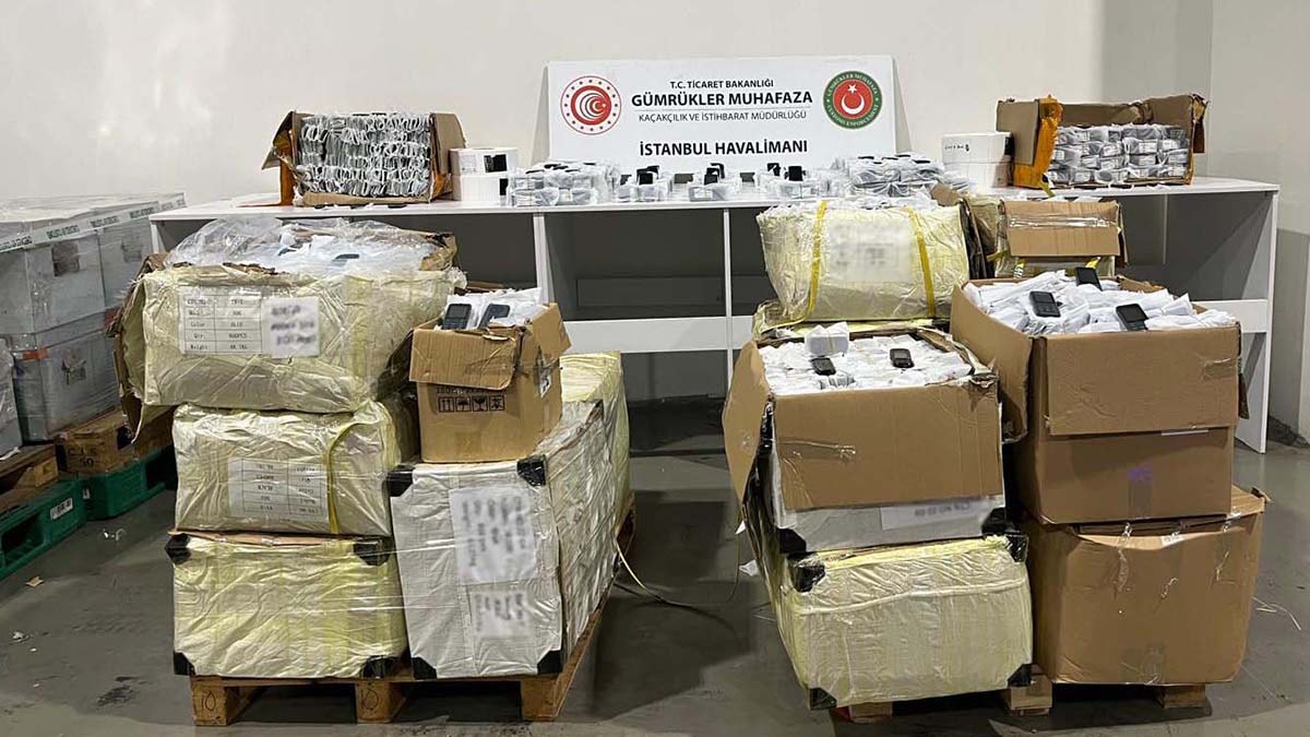 Gümrük muayene bölgesine getirilen kargolarda yapılan aramada, 15 bin 485 adet kutusuz, kablosuz ve bataryasız cep telefonu, 15 rulo halinde 50,8 kilo etiket, 600 gram telefon aksamı ve 1 palette yaklaşık 790 kilo USB kablosu ele geçirildi.