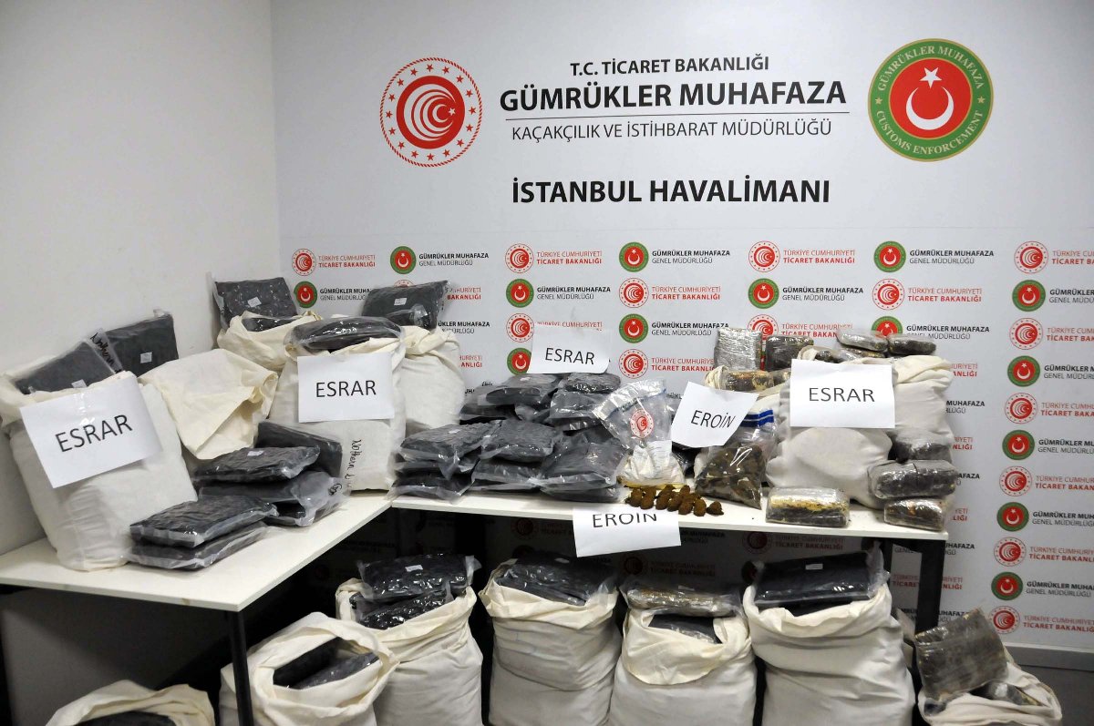 İstanbul Havalimanında Gümrük Muhafaza ekiplerince gerçekleştirilen üç operasyon sonucunda yaklaşık 13 milyon 500 bin lira değerinde 155 kilogram ağırlığında uyuşturucu ele geçirilirken uyuşturucuyu Türkiye'ye sokmak isteyen yabancı uyruklu 6 yolcu gözaltına altı işlemlerinin tamamlanmasının ardından tutuklandı. (DHA)