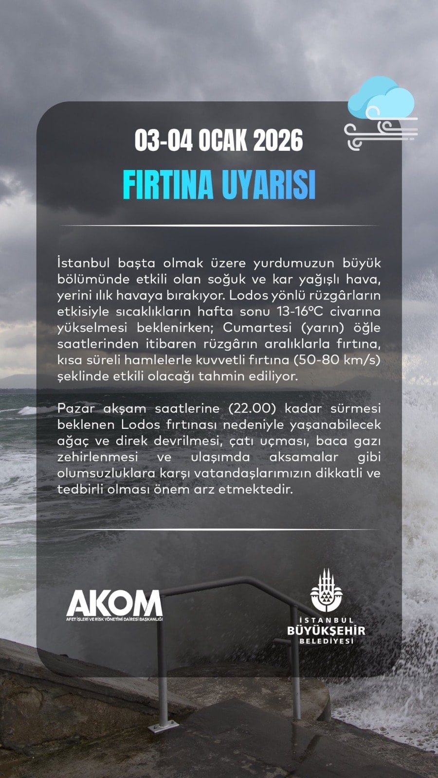 İstanbul'da yarın öğle saatlerinden itibaren etkili olması beklenen lodos fırtınası nedeniyle ağaç ve direk devrilmesi, çatı uçması ve baca gazı zehirlenmesi gibi olumsuzluklara karşı dikkatli olunması istendi.