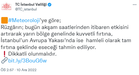 * Rüzgârın; 10 Aralık 2022 Cumartesi akşam saatlerinden itibaren etkisini artırarak 11 Aralık 2022 Pazar günü bölge genelinde (İstanbul, Edirne, Kırklareli, Tekirdağ, Kocaeli, Sakarya ve Yalova) güney yönlerden fırtına ve kuvvetli fırtına (50-80 km/saat), Edirne ve Kırklareli çevreleri ile Tekirdağ'ın doğusu ve İstanbul'un Avrupa Yakasında zaman zaman hamleli olarak tam fırtına (80-100 km/saat) şeklinde eseceği tahmin ediliyor. Ağaç ve direk devrilmesi, çatı uçması, soba ve doğalgaz kaynaklı baca gazı zehirlenmesi ile ulaşımda aksamalar gibi olumsuzluklara karşı dikkatli ve tedbirli olunmalıdır. (AA, DHA)