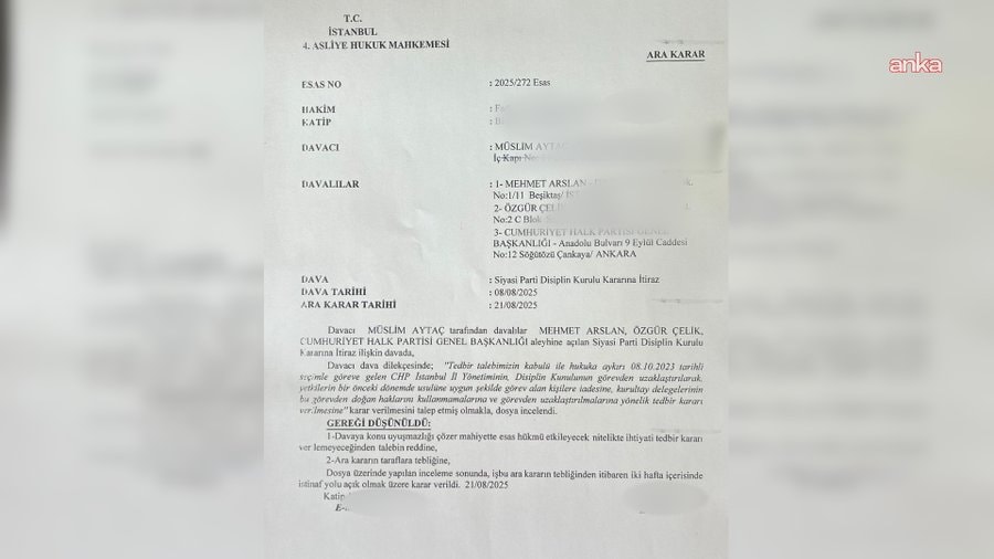 İstanbul 45'inci Asliye Hukuk Mahkemesi'nce hafta başında görevden alınan CHP İstanbul il yönetiminin daha önce görevden alınması talebiyle yapılan bir başvurunun İstanbul 4'üncü Asliye Hukuk Mahkemesi'nce reddedildiği ortaya çıktı.