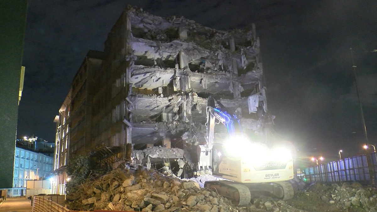 Fatih'te uzun süredir atıl durumda bulunan İstanbul Ticaret Borsası'na ait 6 katlı binada yıkım çalışması yapıldı. Dün başlayan çalışmalar, gündüz trafiğin aksamaması için bu gece de devam etti.