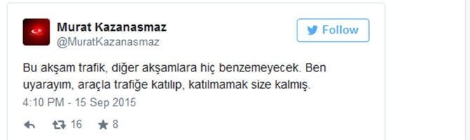 Kazanasmaz Twitter hesabından "Bu akşam trafik diğer akşamlara hiç benzemeyecek. Ben uyarayım, trafiğe katılıp, katılmamak size kalmış" mesajını paylaştı.