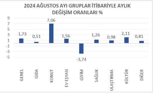 Ağustosta perakende fiyatlarda bir önceki aya göre konut harcamalarında yüzde 7,06, kültür eğitim ve eğlence harcamaları grubunda yüzde 2,11, ev eşyası harcamalarında yüzde 1,56, sağlık ve kişisel bakım harcamaları grubunda yüzde 1,26, ulaştırma ve haberleşme harcamaları grubunda yüzde 0,98, diğer harcamalar grubunda yüzde 0,81, gıda harcamalarında yüzde 0,51 artış, giyim harcamaları grubunda yüzde 3,74 azalış oldu.