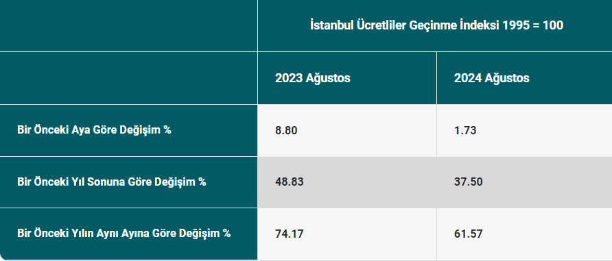 Perakende fiyatları yansıtan ve 2024 Temmuz ayında yüzde 4,21 artış izlenen İstanbul Ücretliler Geçinme İndeksi, 2024 Ağustos ayında yüzde 1,73 oranında artış gösterdi. İndekste yıllık artış oranı ise ağustosta yüzde 61,57'ye geriledi. Temmuza oran yüzde 72,8 olmuştu.