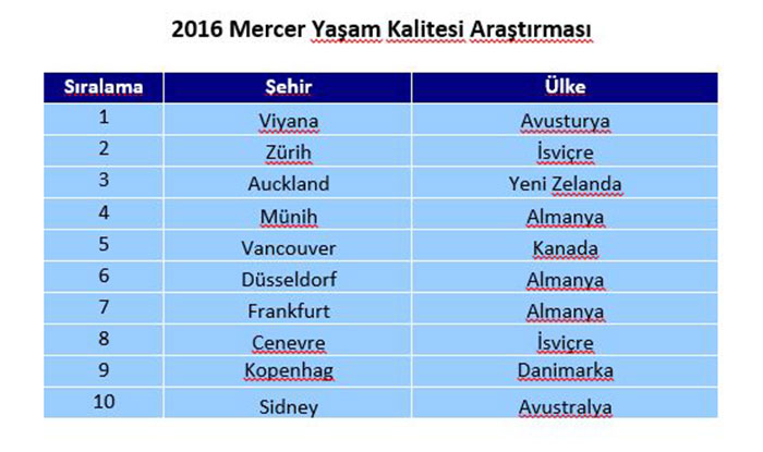 Global piyasaların lider insan kaynakları yönetim danışmanlığı firması Mercer’ın beş kıtada 230 şehri kapsayan 2016 yılı Yaşam Kalitesi Araştırması sonuçları açıklandı. 2016 yılında dünyanın yaşam kalitesi en yüksek şehri Viyana oldu. Sıralamada Zürih ikinci, Auckland üçüncü sırada yer alırken, İstanbul geçen yıl olduğu gibi 122. sırada kendine yer buldu.